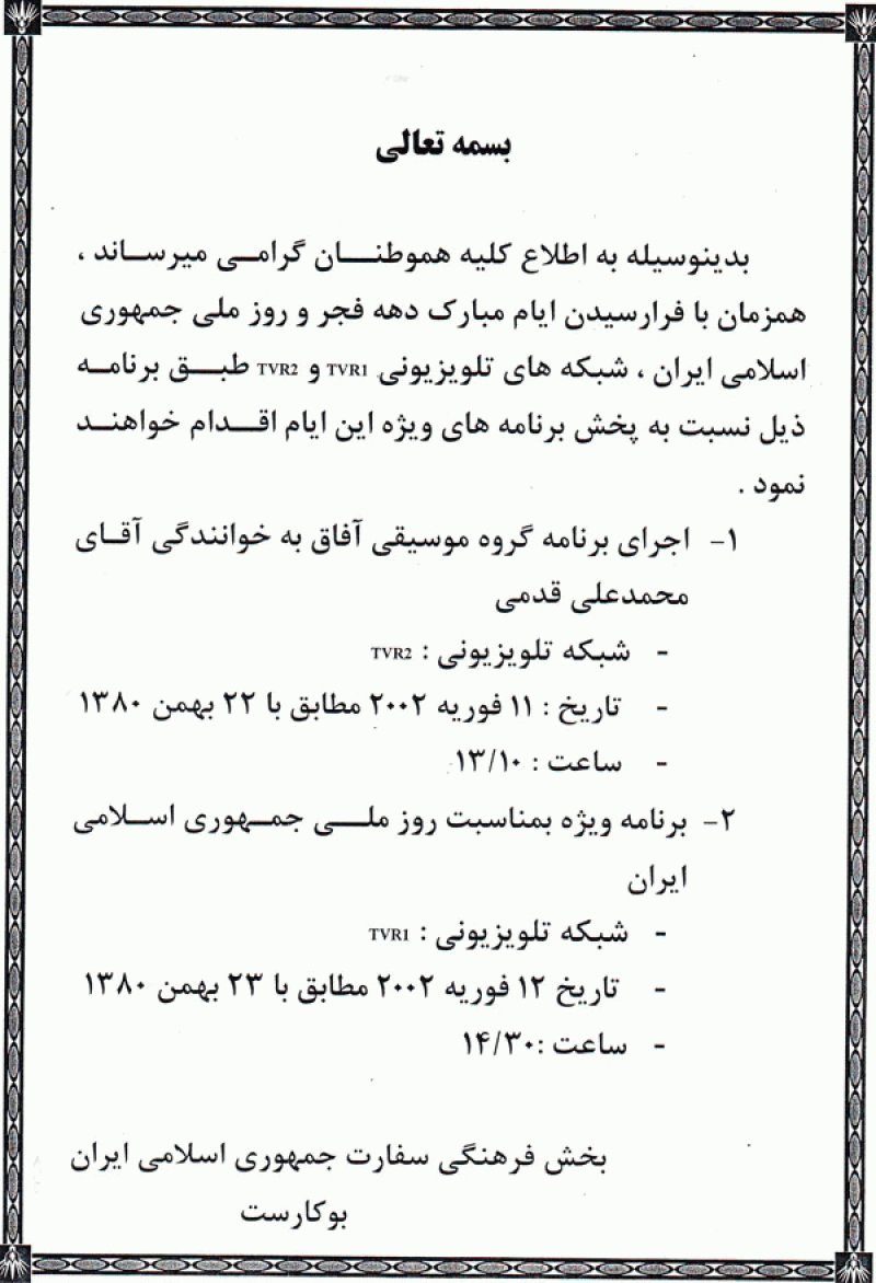 گروه موسیقی ساقی به سرپرستی و خوانندگی استاد محمد علی قدمی(ساقی) آماده همکاری برای اجرای برنامه های هنری می باشد تلفن = 09337967229